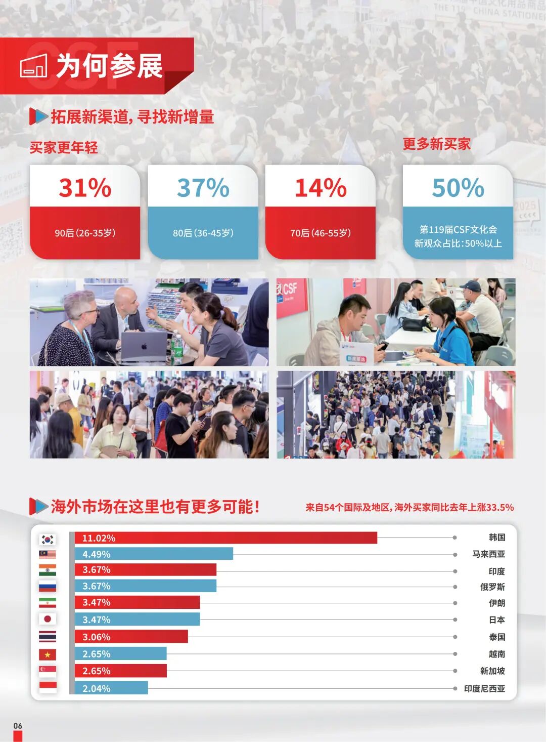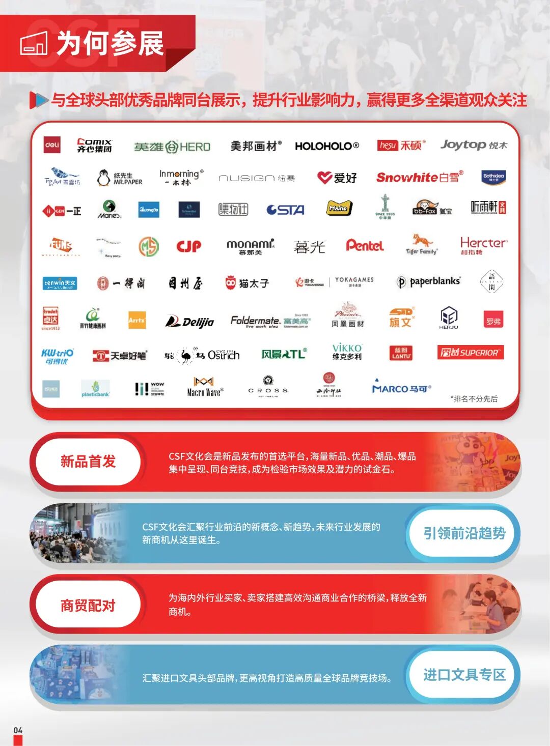 「参展邀请函」第120届中国文化用品交易会2026上海文具展发表时间:2025-10-13 16:17 ![]() ![]() ![]() ![]() ![]() ![]() ![]() ![]() ![]() ![]() ![]() ![]() 关于中国文化用品商品交易会 第120届中国文化用品商品交易会(简称CSF上海文具展)是文化和办公用品行业领先的国际性盛会之一。诞生于1953年的CSF文化会,经过70余年的不断扎根与沉淀发展,已成为全球聚焦的行业盛会,及集信息和商贸于一体的国际化行业平台 经过多年积淀与不断创新,CSF文化会在文具与办公用品的基础上,融合文创礼品、文旅资源、潮流玩具和二次元周边等元素,已经发展为贯穿文化办公和文创潮流的超级平台。CSF文化会始终致力于连接传统与创新,携手全球业界共同绘制文化消费新图景。 第120届CSF文化会将携于第27届华礼展,于2026年6月26-28日在上海新国际博览中心举办。来自国内外的近两千家知名品牌参与,展品涵盖文具办公、专业画材、学生用品、文创产品、礼品、潮流玩具和二次元周边等十多个类别。 |