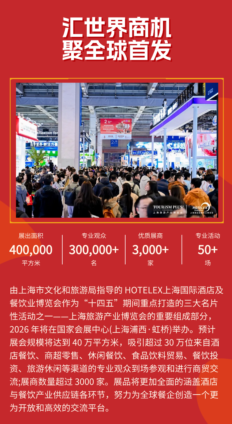 咖啡博览_2026上海国际咖啡茶饮博览会_34届HOTELEX餐饮展发表时间:2026-01-14 14:09 ![]() 2026年3月30日-4月2日,HOTELEX上海国际酒店及餐饮业博览会将于国家会展中心(上海浦西·虹桥)再度启幕。本届展会规模预计达40万平方米,汇聚超过3000家展商,吸引逾30万位专业观众到场交流,涵盖酒店、餐饮、商超零售、食品贸易、投资休闲等多重渠道。展会期间将举办50余场专业活动,全面覆盖酒店与餐饮产业链各环节,致力于打造一个开放、高效、前沿的全球餐企互动平台。 ![]() ![]() ![]() ![]() ![]() 咖啡,作为全球最具影响力的饮品之一,其市场正呈现蓬勃增长的态势。数据显示,中国咖啡市场更是以惊人的速度扩张:2024年产业规模预计达3133亿元,较2023年增长18%,年均复合增长率高达 17.14%,远超全球平均水平。在这一背景下,HOTELEX上海展咖啡板块应势而生,成为链接全球咖啡资源、推动行业互联的关键枢纽。咖啡板块作为HOTELEX的核心组成部分,展出面积超过15万平米,占展会总面积的37.5%。板块以“全产业链整合”为理念,覆盖从种植、加工、烘焙、物流到零售的每一个环节,构建起从种子到杯子的完整产业链体系。 汇聚行业之力,共筑咖啡新生态 ![]() ![]() ![]() ![]() ![]() 展出类别全面且精细,主要包括: · 咖啡原料及设备:涵盖生豆、烘焙豆、拼配豆、冻干咖啡、挂耳咖啡、咖啡液、胶囊咖啡、即饮与现制咖啡等全品类原料,以及糖、乳制品、香料等辅料; · 咖啡制作与加工设备:包括意式、美式、手冲、胶囊咖啡机、磨豆机、虹吸壶、法压壶、烘焙机、筛选机等前沿设备; · 餐饮食品及相关设备:延伸至烘焙食品、甜品、冰淇淋、零食及配套冷藏、烘焙、制冰等设备; · 咖啡馆空间与文化体验:涵盖家具、灯具、装饰、文化周边、服饰配饰等,助力品牌打造沉浸式消费场景; · 产业技术与服务支持:包括种植技术、物流包装、质量检测、信息化系统、POS系统、店铺设计等全流程服务。 HOTELEX上海国际咖啡美酒美食节将继续汇聚咖啡、茶饮与美酒品牌,打造集商贸、体验、趋势洞察于一体的沉浸式嘉年华,构建专业酒商、精准买家与爱好者的互联平台。 全球风味CHA饮文化节将持续通过产品、市场、渠道、文化的资源整合,打造一场融合传承与创新,链接国内与海外,面向行业未来的行业盛会。 ![]() ![]() ![]() ![]() ![]() 2026年HOTELEX上海国际酒店及餐饮业博览会的茶饮板块汇聚行业力量,集结行业内核心展商,构建从原料供应、配方研发到包装设备的完整产业链。 茶饮板块部分展商(滑动查看) ![]() 浙江圣吗哪乳业有限公司 上海诚宇包装集团有限公司 忆美园(福建)农业开发有限公司 君乐宝乳业集团股份有限公司 大闽食品(漳州)有限公司 欧本食品(海南)有限公司 合肥恒鑫生活科技股份有限公司 浙江欧跃科技有限公司 江苏品胜智能科技有限公司 昆山速品食品有限公司 立宇食品(郎溪)有限公司 / 上海提点信息科技有限公司 新天力科技股份有限公司 西树食品(无锡)有限公司 海南省文昌南椰实业有限公司 浙江拉斯贝姆餐饮设备有限公司 江苏千牛乳业有限公司 上海奕方农业科技有限公司 广西果然食品科技有限公司 桂林普兰德生物科技有限公司 余姚市万事达食品有限公司 海南南派实业有限公司 商丘市饮之健生物科技有限公司 东莞市森糖食品有限公司 黄山水工茶业有限公司 江苏大晃传英食品科技有限公司 河南逅唐贸易有限公司 上海鑫晶行食品有限公司 上海唯奇食品科技有限公司 四川奉贵人茶业有限公司 台州超鼎塑业有限公司 厦门天至茶业有限公司 深圳市意利投资控股有限公司 安徽唯可鲜食品科技有限公司 天津育新塑料包装有限公司 合浦果香园食品有限公司 上海日远饮品集团有限公司 厦门雅美特工贸有限公司 佛山市鸣淳科技有限公司 连晟食品科技(上海)有限公司 滕州小目标食品科技有限公司 江西恒顶食品有限公司 仙居 阜南县顺昌塑业有限公司 浙江万茶茶业科技有限公司 贝研乳制品(山东)有限公司 维益食品(滁州)有限公司 安徽华杰鑫森新材料科技有限公司 福州市帮利茶业有限责任公司 遵义遵道智造实业有限公司 石家庄吃米包装制品有限公司 贵州春水堂茶业有限公司 杭州云茶兴食品有限公司 广西横县张一元饮品有限公司 绍兴御茶村茶业有限公司 格瑞食品科技(天津)有限公司 宁波家联科技股份有限公司 东莞市壹糖天下糖业有限公司 鑫永安 上海花洁尔纸业集团有限公司 丰亦实业(上海)有限公司 上海麦瑞餐饮管理有限公司 苏州市茂记库生态食品科技有限公司 深圳市深宝华城科技有限公司 湖北香园食品有限公司 双桥(广州)有限公司 上海乃士餐饮企业管理有限公司 广州珈兴贸易有限公司 贵州贵茶(集团)有限公司 北京三元食品股份有限公司 蒙牛集团 昆山真金食品有限公司 伊家好奶酪 ![]() SmartEats @HOTELEX 上海国际功能食品及饮料展 ![]() 在健康生活理念日益普及的背景下,国民健康意识持续提升,中国消费者正通过茶饮、汤品、功能性零食等多种饮食形式,将“功能性”与“食养”理念逐步融入日常生活。 ![]() SmartEats 上海国际功能食品及饮料展旨在聚焦当前最受市场青睐的功能性食品与健康食品品牌,展现行业前沿趋势与消费新动向。 ![]() 展品品类 轻食零食 蛋白棒、全麦饼干、无糖巧克力、低糖及无糖饼干糕点、有机谷物、有机